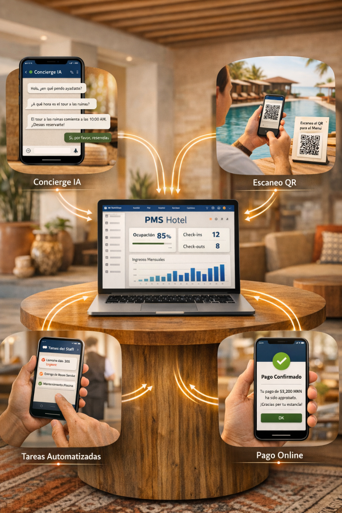 Desde la experiencia del huésped hasta la operación interna, conectamos cada punto de tu negocio con inteligencia artificial.
